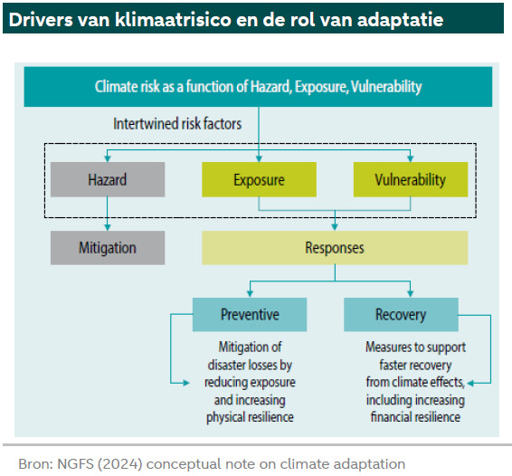 Financiële veerkracht kan niet zonder fysieke veerkracht. Een grotere fysieke weerbaarheid is nodig om verzekeringen tegen klimaatrisico's betaalbaar te houden. Naast het opbouwen van fysieke en financiële weerbaarheid tegen vaker voorkomende extreme weersomstandigheden, is adaptatie aan de chronische fysieke risico's die klimaatverandering met zich meebrengt essentieel. Voorbeelden hiervan zijn aanpassing aan de gevolgen voor arbeid en landbouwproductiviteit, maar ook aanpassing aan verhoogde hittestress in stedelijke gebieden en aan verminderde beschikbaarheid en kwaliteit van de watervoorziening.