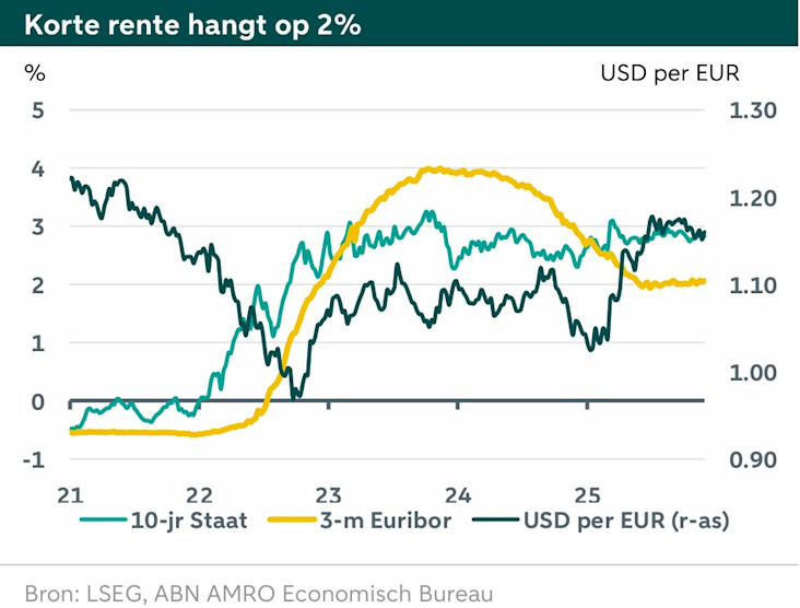 Ondanks Amerikaanse invoerheffingen staat de economie van de eurozone er eind 2025 eigenlijk stevig voor. Mede hierdoor zijn de vooruitzichten voor 2026 dan ook gunstig. Ja, de invoerheffingen drukken de uitvoer en oefenen zo neerwaartse druk uit op de kwartaalgroei. Hiertegenover staat dat de binnenlandse vraag verder aantrekt. We verwachten weliswaar geen verdere renteverlagingen van de ECB, maar de eerder doorgevoerde verlagingen sijpelen nog door naar de reële economie en vormen zo een steun in de rug. Ook overheidsuitgaven, aan bijvoorbeeld defensie, en de Duitse investeringen in infrastructuur dragen bij aan dit bemoedigende beeld.