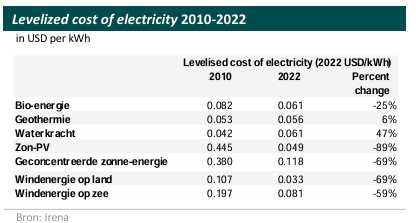 Naast de energiemix hebben ook de totale extra kosten van de opgewekte elektriciteit invloed op de marginale reductiekosten. Hiervoor hebben we de levelized costs of electricity (LCOE) van de hernieuwbare technologieën genomen, exclusief belastingen en subsidies. LCOE is de contante waarde van de totale kosten gedurende de levensduur gedeeld door de contante waarde van alle elektriciteit die gedurende de levensduur is opgewekt. De uitkomst zijn de kosten in Amerikaanse dollars per kWh elektriciteit. Tussen 2010 en 2022 zijn deze kosten voor de belangrijkste hernieuwbare technologieën aanzienlijk gedaald (zie onderstaande tabel). Dit zijn mondiale gemiddelden. De kosten voor zonne-energie daalden met 89%, geconcentreerde zonne-energie en windenergie op land met bijna 70% en windenergie op zee met bijna 60%. Lagere kosten leiden ook tot lagere marginale reductiekosten voor de verschillende technologieën. Alleen de kosten voor waterkracht en geothermische energie zijn in deze periode gestegen.